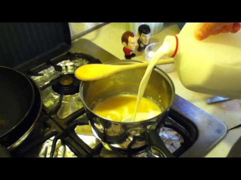 - Slowly bring this mixture to a boil and test for consistency. It should be thick enough so when you bring a spoon out of it, the sauce will coat the spoon thickly and run off in a thin ribbon. If it is too thick, add more milk a bit at a time and repeat this process.